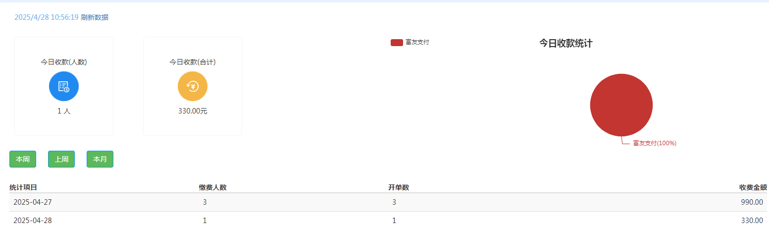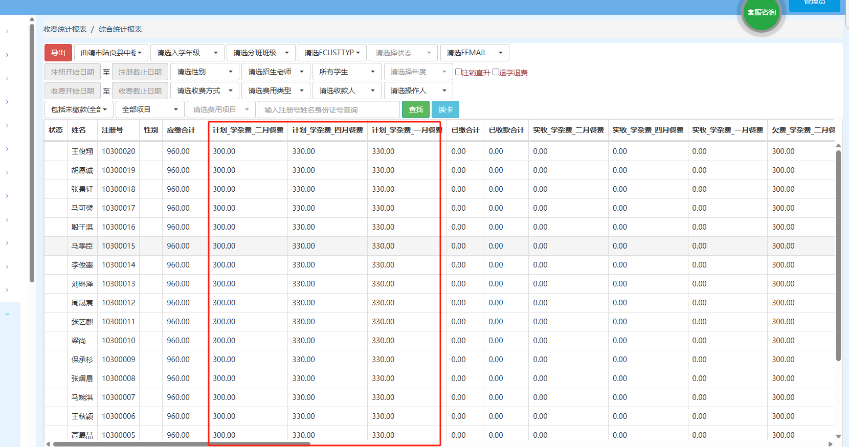 ②自动生成收费相关各类统计报表,如:前台收款统计、前台汇总统计、前台收费流水账、财务收款查询、实缴学生明细