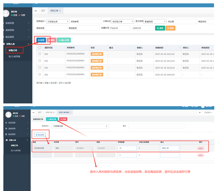 点击添加货物,只需在商品名称处输入货物名称,系统即刻快速查询出对应货物并带出货物单价。工作人员无需繁琐操作,直接输入数量,采购金额便能瞬间呈现,极大简化了入库人员的订单信息录入流程,使确认订单金额变得轻松自如。