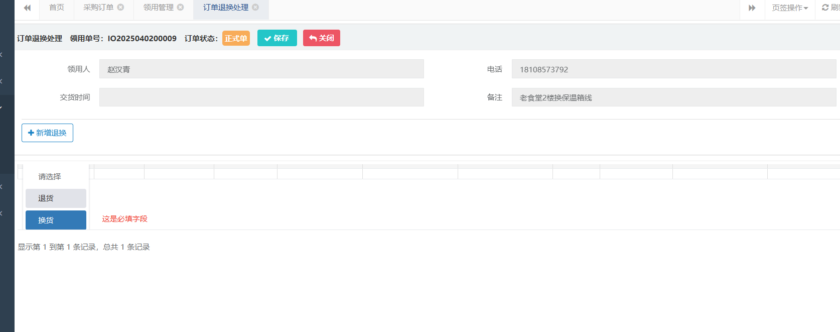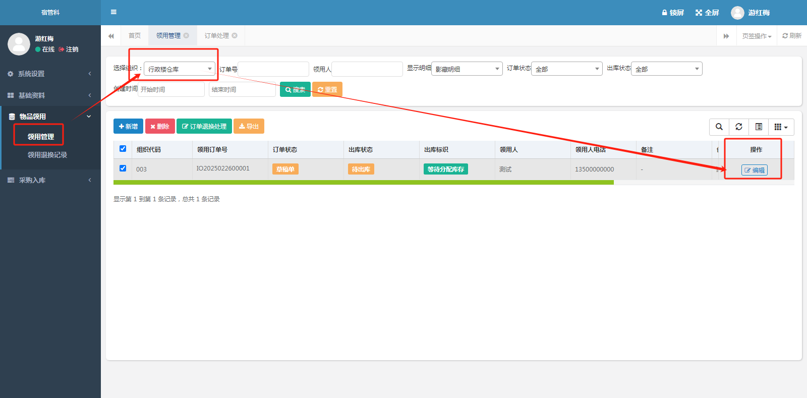 出库领用界面人性设计,输入领用人姓名,系统即刻精准定位并选中领用人,其部门及基本信息随之自动带出,无需额外输入,大幅提升领用效率。