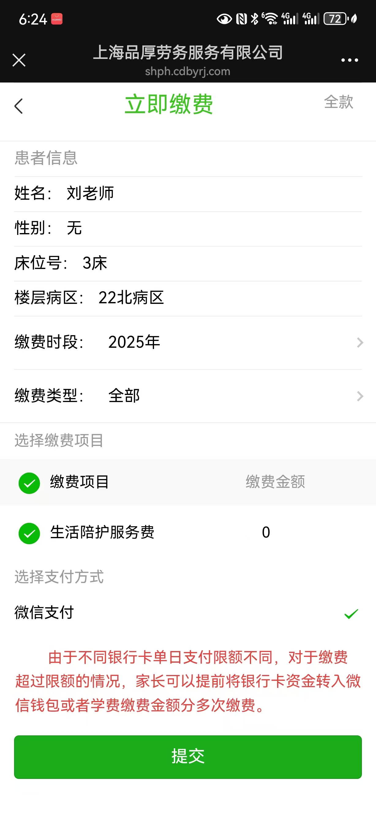 支付顺畅,灵活省心 :填写信息后,瞬间跳转至缴费页面,仅需关注 “生活陪护服务费” 单一项目,输入金额即可一键支付。