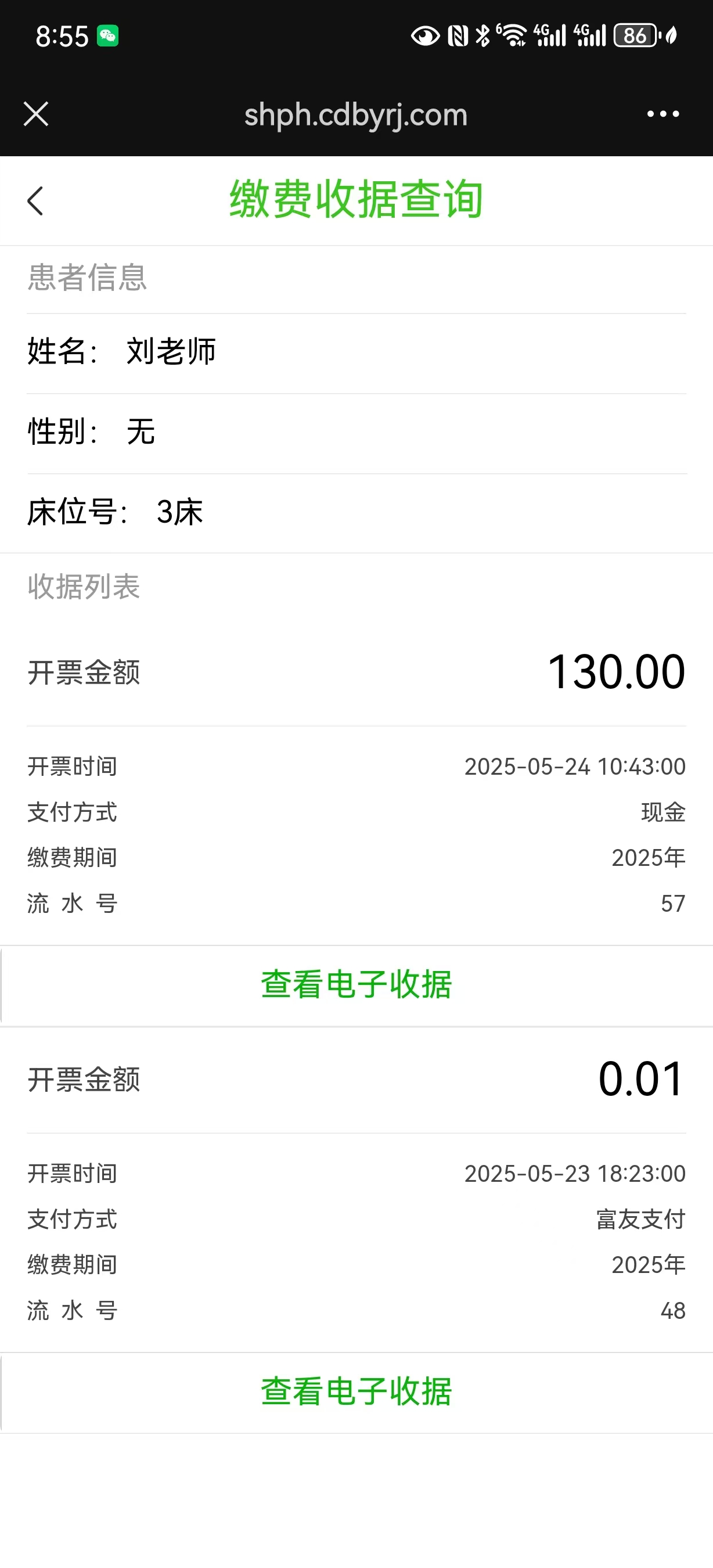 电子收据,随时可查 :病员家属支付后,电子收据随时在线查询,方便又环保。即使是线下制单收费,线上电子收据也能同步更新,无需打印,轻松实现无纸化办公。