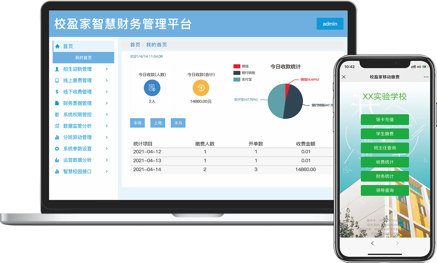 率先在学校财务收费管理领域实现线上线下一体化管理,数据实时共享,移动端、云端、电脑端完美结合;